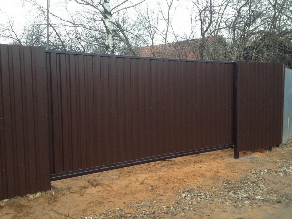 Откатные ворота из профнастила на винтовых сваях (цена на бетонном основании +20000р)